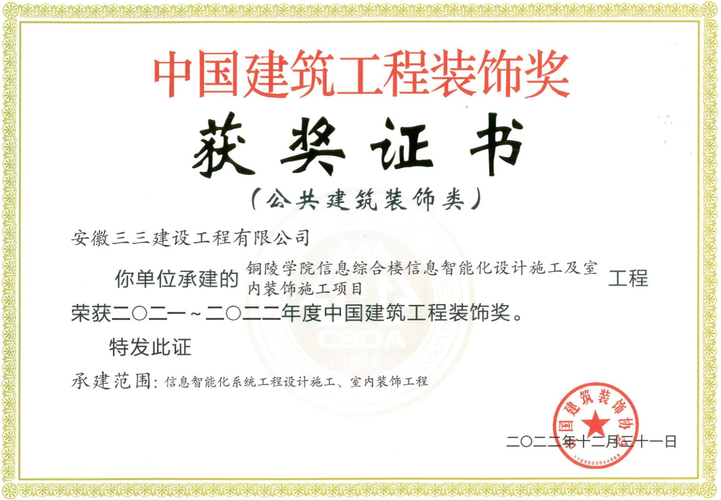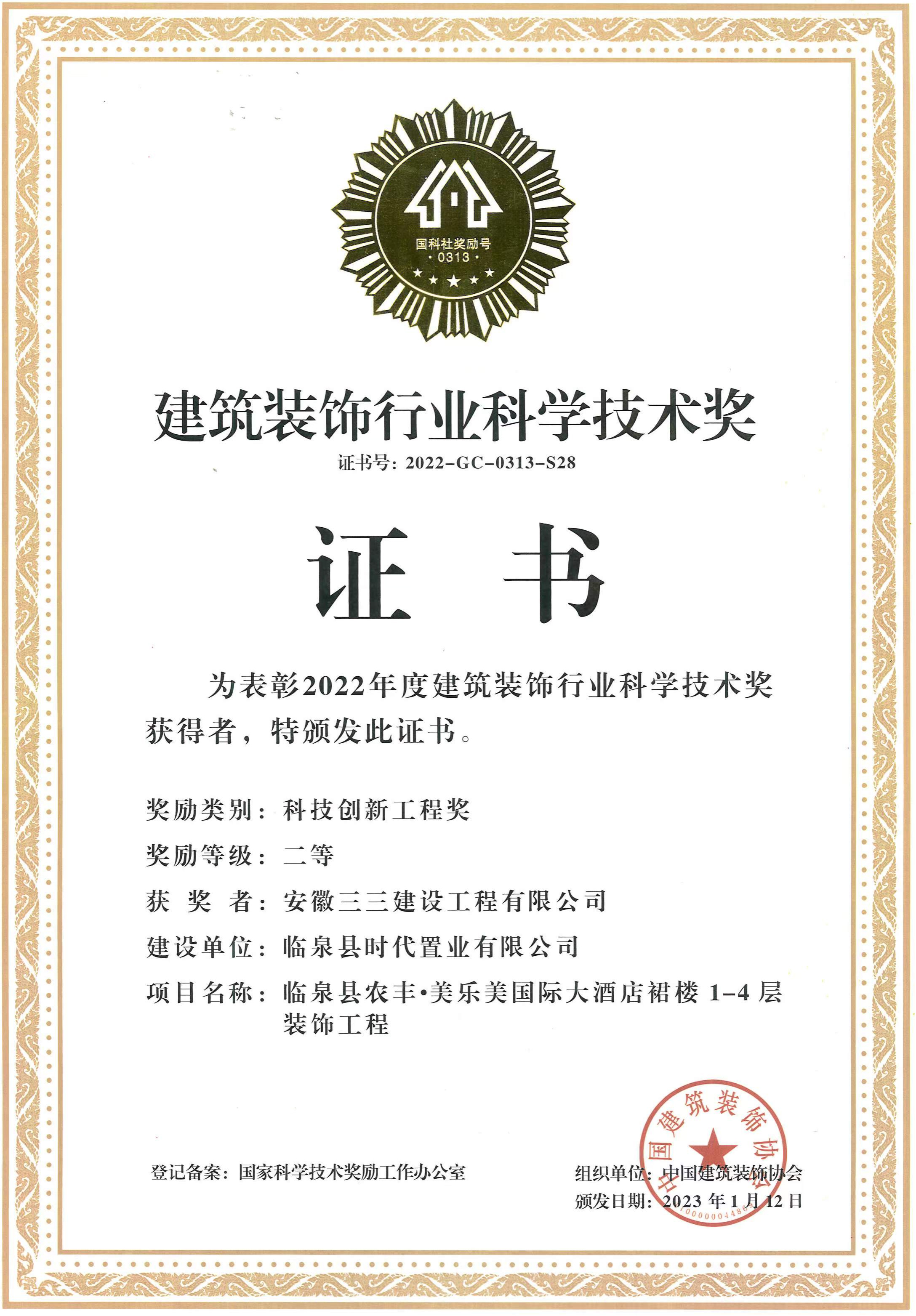 報告會上還進行了2021—2022年度中國建筑裝飾行業科學技術獎頒獎、2021年度中國建筑裝飾協會綜合數據統計發布和2021—2022年度中國建筑工程裝飾獎頒獎。三三建工承建的“阜陽卷煙廠易地技改項目—生產指揮中心及后勤服務用房配套工程(內外裝飾施工) ”和“銅陵學院信息綜合樓信息智能化設計施工及室內裝飾施工項目”兩項工程榮獲“中國建筑工程裝飾獎”。承建的“臨泉縣農豐·美樂美國際大酒店裙樓1-4層裝飾工程”榮獲“中國建筑裝飾行業科學技術獎—科技創新工程獎”,該獎項的獲得代表著三三建工在建筑裝飾領域的專業技術、學術水準、管理經驗等方面有了一定的實力積淀和創新能力,一直以來,三三建工始終高度重視建裝領域新技術的研究和應用,努力構筑自主知識產權體系,以新技術助推企業高質量發展。